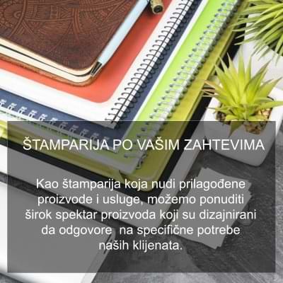 Kao štamparija koja nudi prilagođene proizvode i usluge, možemo ponuditi širok spektar proizvoda koji su dizajnirani da odgovore na specifične potrebe naših klijenata. Prilagođeni proizvodi mogu se koristiti za različite svrhe, od poslovnih promotivnih materijala, do personalizovanih poklona i drugih proizvoda koji se koriste u mnogim industrijama.